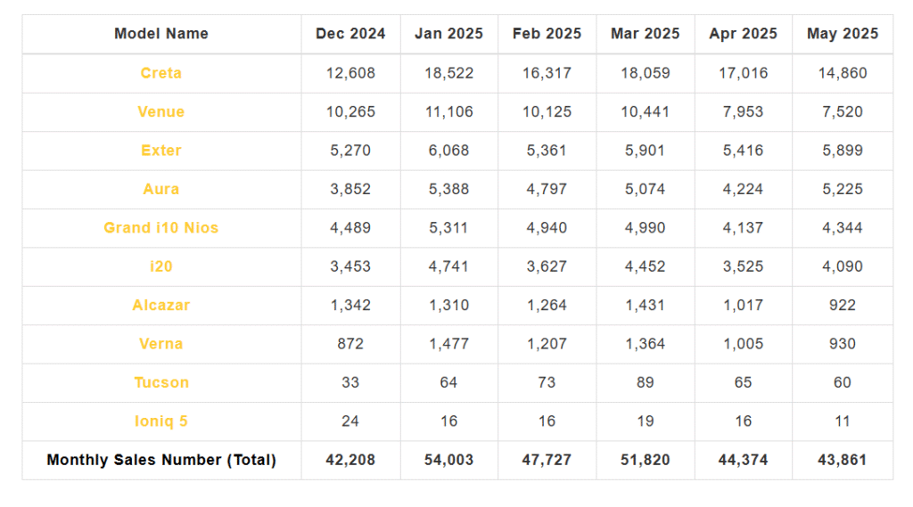 In May 2025, Despite the overall decline, the Hyundai Creta remained the company’s strongest volume contributor, it is the one of the most demanding product of Hyundai holding firm at the top of the midsize SUV leaderboard and is a regular feature in the top ten sales charts .